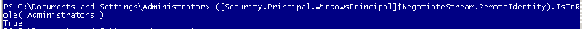 ([Security.Principal.WindowsPrincipal]$NegotiateStream.RemoteIdentity).IsInRole('Administrators')