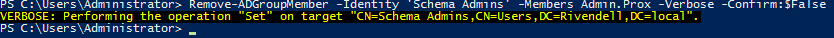 No verbose output here, but we do get object output showing that the update was successful! Now we remove our account from Schema Admins and log out and back in and then move on to our next part.