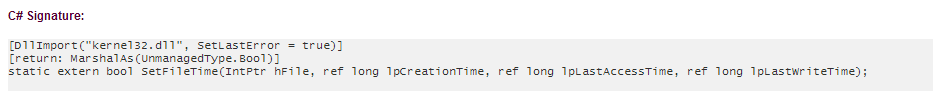 Simple enough, now for something that required a little more work. The SetFileTime method requires 4 parameters (Handle,CreationTime,LastAccessTime,LastWriteTime) in order for it to work properly. The handle piece I will get into a little later and the CreationTime is a non-issue (meaning I will supply $Null to it). This just leaves the LastAccess/LastWrite parameters to deal with. Reading up on the msdn documentation, I can find that if I pass the value of 0xFFFFFFFF, the file system operations will be prevented from writing to their respected attributes. I could choose one or the other to prevent, or in the case of my examples, I chose to block both of these attributes from being modified.