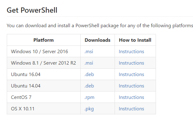 Now, I mentioned that Linux is now an OS that supports running PowerShell. Currently there are a few distributions that it seems to support in Ubuntu and CentOS, but I imagine that more will be added as time progresses. Also MacOS is included in the list that you can install it on.